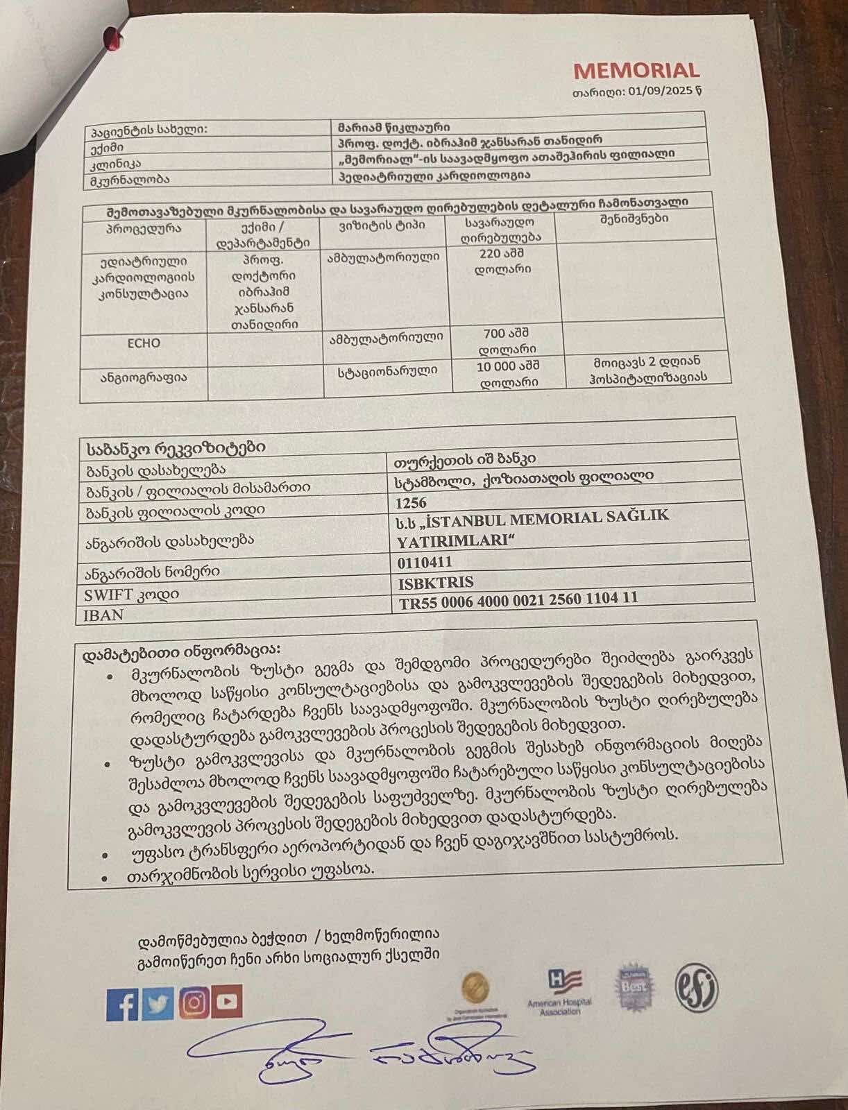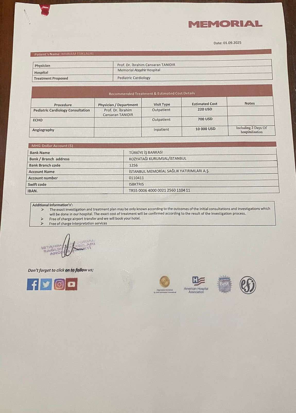 🆘 ველოდებით თანხის სრულად აგროვებას რომელიც ინვოისშია მოცემული 11.000$ რომ გადავიყვანოთ თურქეთში კერძოთ მემორიალის კლინიკაში, უკვე მესამედ ვინაიდან საქართველოშიც და ტრაპიზონშიც გვეუბნებიან კიდევ ერთ ოპერაციას. თურქეთის მემორიალის კლინკიდან კი გვეუბნებიან რომ ოპერაციის ანუ გაჭრის გარეშე ანგიოგრაფიით შესაძლებელია სისხლძარღვების გაფართოება ისე რომ მარიამ ოპერაცია აღარ დასჭირდეს, ყველა საბუთი გვაქვს ნათარგმნი დამოწმებული