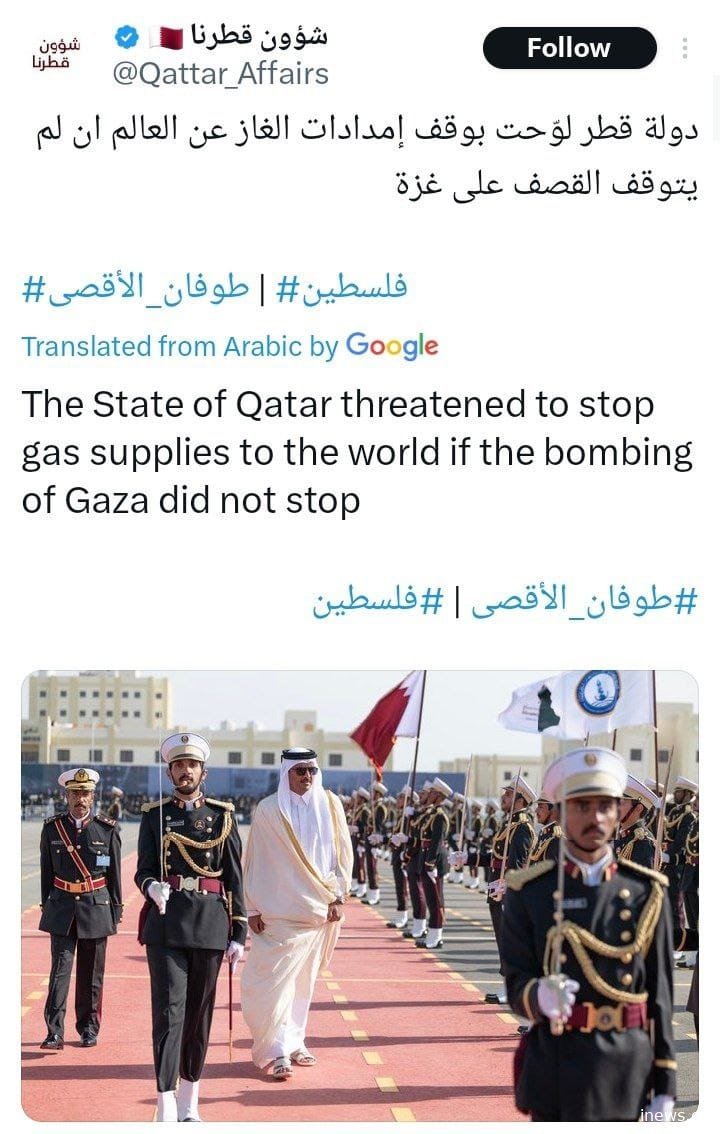 ყატარის ემირი შეიხ თამიმ ბინ ჰამად ალ თანი იმუქრება, რომ მსოფლიოსთვის გაზის მიწოდებას შეწყვეტს, თუ ღაზას დაბომბვა არ შეწყდება.