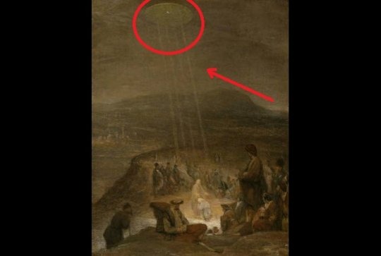 ამ იდუმალ ფერწერულ ნამუშევარზე ასახულია უზარმაზარი დისკოს ფორმის ობიექტი ცეცხლმოკიდებული ტაძრის თავზე. მიუხედავად იმისა, რომ ისტორიკოსების ნაწილი ამტკიცებს, რომ ობიექტი უბრალოდ კვამლია და მეტი არაფერი, სხვებს ეჭვი არ ეპარებათ იმაში, რომ დისკო უცხოპლანეტელებთანაა კავშირში.image2) ეუქარისტის დიდება - ვენტურა სალიმბენი (1600 წლები ან უფრო ადრე)