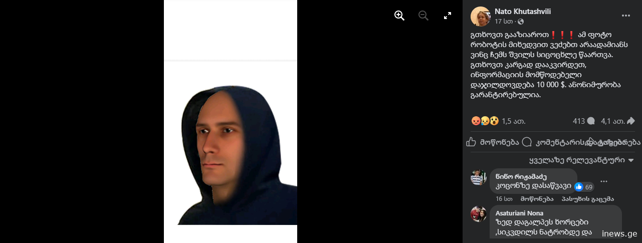 “გთხოვთ გააზიაროთ, ამ ფოტორობოტის მიხედვით ვეძებთ არაადამიანს, ვინც ჩემს შვილს სიცოცხლე წაართვა.