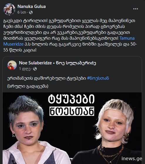 "გავსკდი ტირილით! გემუდარებით ყველას მეც მაპოვნინეთ ჩემი ძმა! ჩემი ძმის დედას რომელის პირად ცხოვრებას ვუფრთხილდები და არ ვეკარები,ვემუდარები გადაეცით მითხრას ყველაფერი რაც მას მაპოვნინებს,გთხოვთ! Tamuna Museridze პ.ს ბოლოს რაც გავარკვიე ხობში გააშვილეს და 50-55 წლის კაცია!", - წერს გულუა.