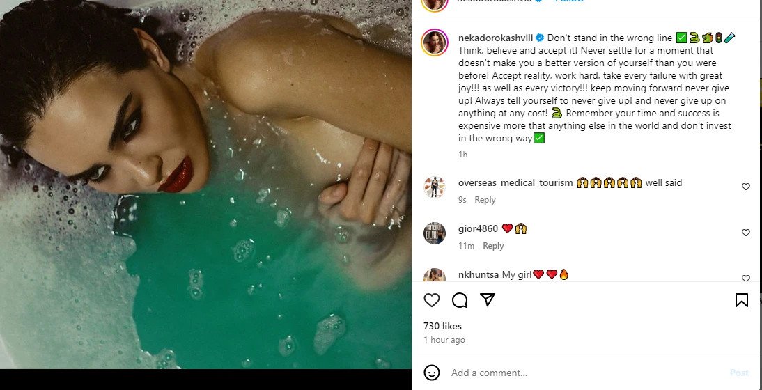 ნიკოლოზ ბასილაშვილის ყოფილი მეუღლე ნეკა დოროყაშვილი სოციალურ ქსელში ახალ ფოტოებს აქვეყნებს, რომელშიც ნახევრად შიშველია.