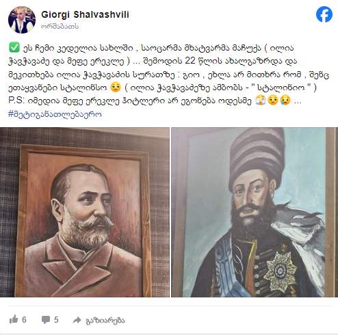 "ეს ჩემი კედელია სახლში , საოცარმა მხატვარმა მაჩუქა ( ილია ჭავჭავაძე და მეფე ერეკლე ) ... შემოდის 22 წლის ახალგაზრდა და მეკითხება ილია ჭავჭავაძის სურათზე : გიო , ეხლა არ მითხრა რომ , შენც ეთაყვანები სტალინსო 😒 ( ილია ჭავჭავაძეზე ამბობს - " სტალინიო " )