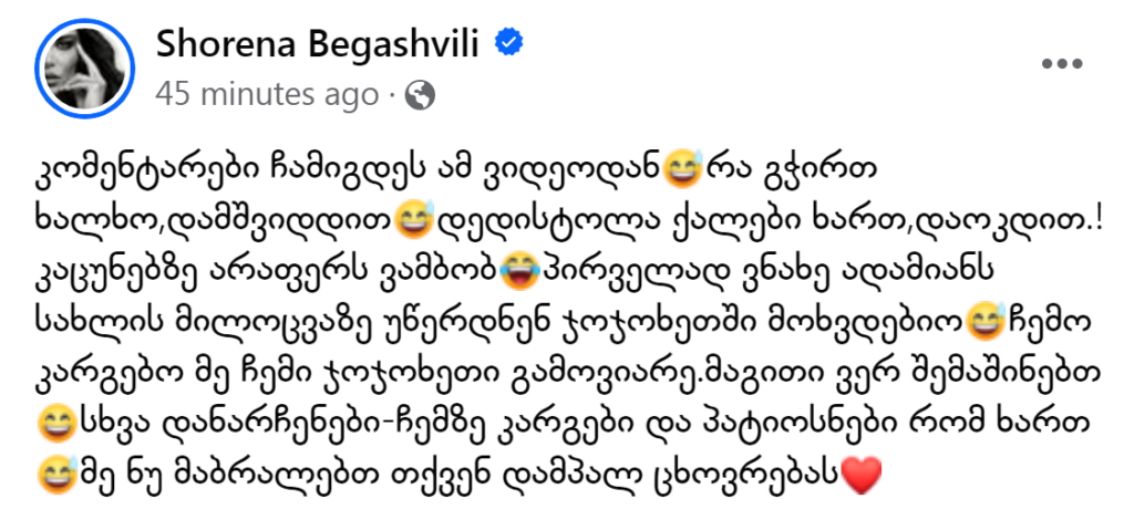 “დედისტოლა ქალები ხართ, დაოკდით.!კაცუნებზე არაფერს ვამბობ.. ჩემო კარგებო მე ჩემი ჯოჯოხეთი გამოვიარე, მაგითი ვერ შემაშინებთ… მე ნუ მაბრალებთ თქვენ დამპალ ცხოვრებას” – შორენა ბეგაშვილი მიმართვას ავრცელებს