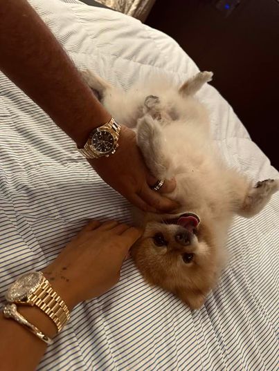 შორენა ფოტოზე ძაღლს ეფერება, სადაც ასევე მამაკაცის ხელიც ჩანს.