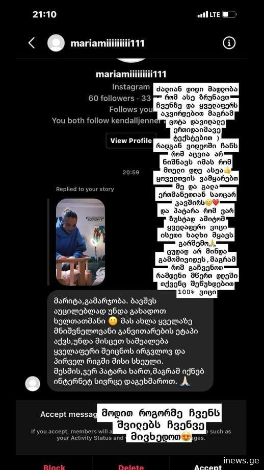 „ძალიან დიდი მადლობა, რომ ასე ზრუნავთ ჩვენზე, მაგრამ ძალიან დავიღალე ერთი და იგივე ტექსტებით. რადგან ვიდეოში ჩანს, რომ ხელთათმანი აცვია, არ ნიშნავს, რომ მთელი დღე ასეა. ყოველთვის ვამყარებთ მე და გალა ერთმანეთთან საოცარ კავშირს. და პატარა რომ ვარ, ზუსტად ამიტომ, ყველაფერი ვიცი, ისეთი ხალხი მყავს გარშემო. ცუდად არ მინდა გამომივიდეს, მაგრამ რომ გაჩვენოთ, რამდენი მწერთ დღეში, თქვენც შეწუხდებით“ – წერს მარიტა მელიქიშვილი.